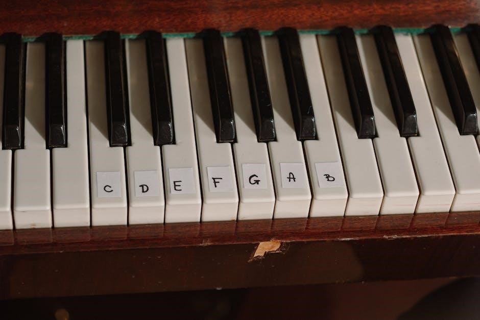 Reading piano chord symbols begins with understanding the structure of chords. A chord symbol typically consists of a root note and its intervals. For example, a C major chord is represented as C, with the notes C, E, and G. Minor chords are indicated with an “m,” such as Cm. Seventh chords, like C7, add an extra note for depth. Diminished and augmented chords use symbols like ° and +. Practice recognizing these symbols in PDF sheet music to improve your ability to translate them into actual notes on the piano keyboard. Regular practice enhances your sight-reading and playing skills effectively.
